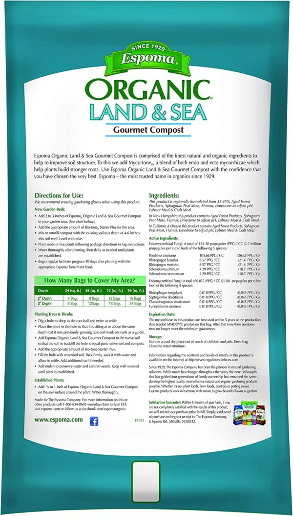 Espoma Organic Land & Sea Gourmet Compost is a special blend of the finest ingredients available. It combines peat and humus from the land and crab and lobster shells form the sea to create a high-quality finished compost.