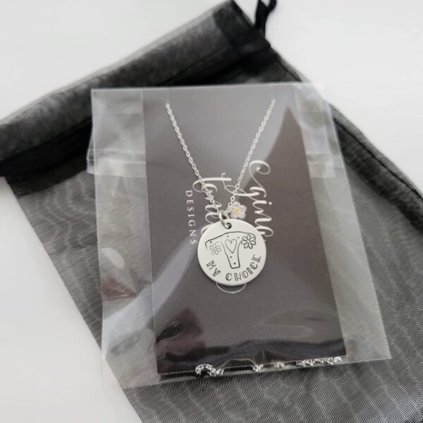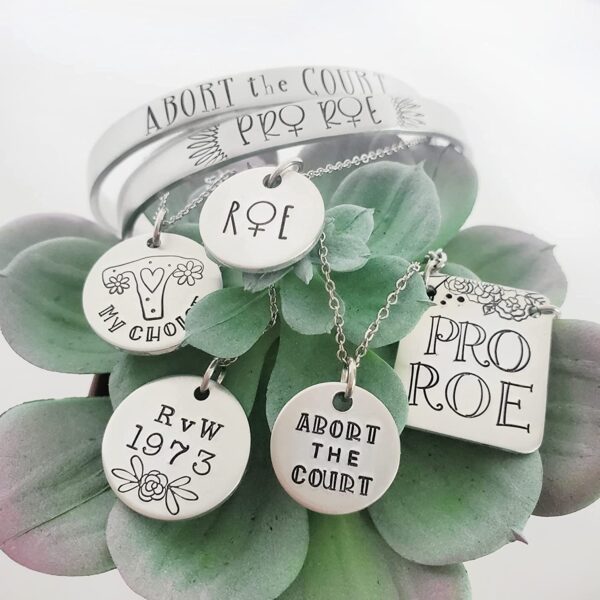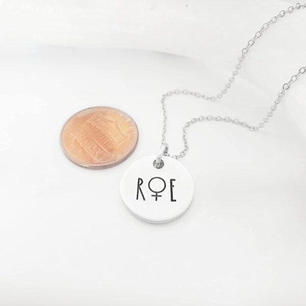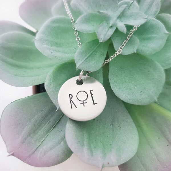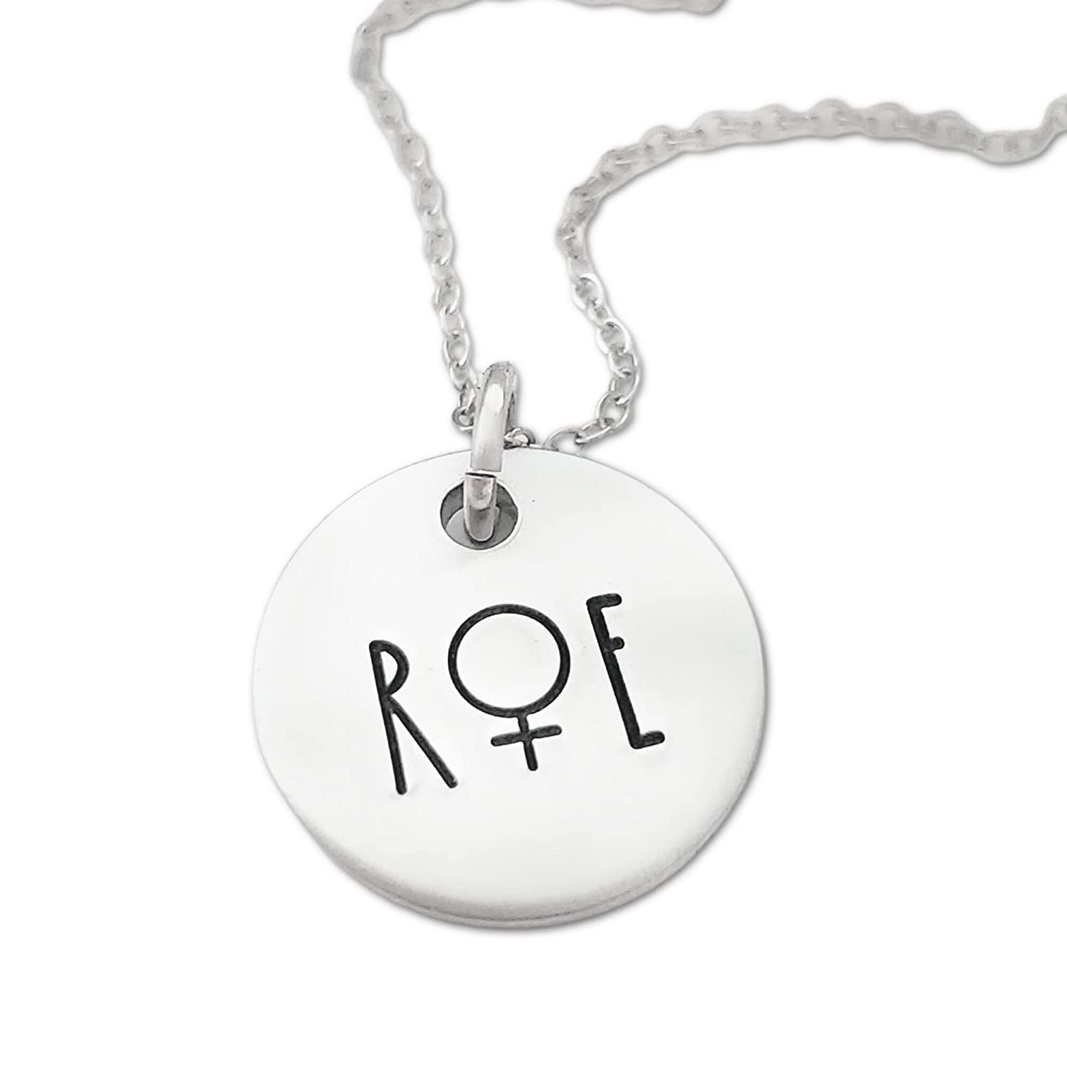 This Pro Choice Necklace has one 5/8″ brushed aluminum disc, hand stamped with “ROE” where the O is replaced with female symbol. Roe V. Wade Feminist Keepsake is hung on a dainty 18″ stainless steel chain. This abortion supporter gift is packaged in a black organza bag. Female Empowerment, Womens Movement
